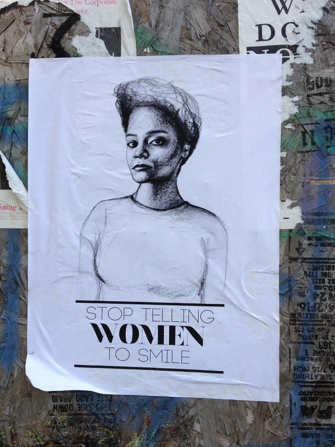 Artist Tatana Fazlalizadeh has attempted to raise awareness about this issue in a very creative and public way by creating posters that reflect women’s stories and struggles with harassment. Ms. Fazlalizadeh says that her work “attempts to address gender based street harassment by placing drawn portraits of women, composed with captions that speak directly to offenders, outside in public spaces.”