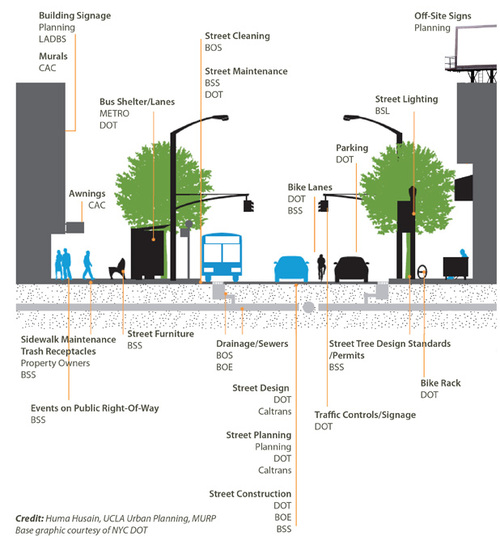 As you can see, Ms. Husain has labeled the Los Angeles city managing agency which oversees different portions of our streets, sidewalks and amenities. While each city has differing managing bodies and management roles, here in Los Angeles, as this diagram illustrates, any change could be a difficult process and large-scale changes (like design modifications that can help our streets become more friendly to bicycles and pedestrians) could be very challenging.